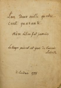 • Trascrizione coeva del celebre romanzo di anticipazione di Mercier, cominciato nel 1768 e stampato nel 1771, il primo del genere nel quale si riverberi la filosofia illuminista ma soprattutto la prima utopia ambientata in un tempo altro anziché in un mondo altro.