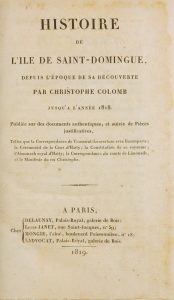 HISTOIRE DE L'ÎLE DE SAINT-DOMINGUE depuis l'époque de sa découverte par Christophe Colomb jusqu'à l'année 1818 ; publiée sur les documents authentiques, et suive de pièces justificatives. Paris : Chez Delaunay, Janet, Mongie,...