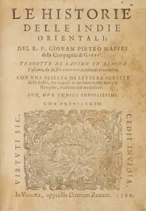 MAFFEI GIOVANNI PIETRO, Le Historie delle Indie orientali [...] tradotte di latino in lingua toscana, da M. FRANCESCO Serdonati… In Venezia : Appresso Damian Zenaro, 1589.