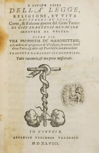 MENAVINO GIOVANNI ANTONIO, I Cinque libri della legge, religione, et vita de' Turchi et della corte, & d'alcune guerre del Gran Turco [...]. Oltre cio, una prophetia de' Mahomettani, et la miseria de' prigioni, et de' Christiani [...] tradotte da...