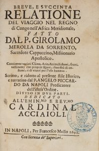 PICCARDO ANGELO, Breve, e succinta relatione del viaggio nel regno di Congo nell'Africa meridionale, fatto dal P. Girolamo Merolla da Sorrento, sacerdote cappuccino, missionario apostolico. In Napoli : Per Francesco Mollo, 1692.