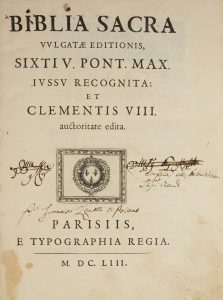 BIBLIA sacra vulgatae editionis, Sixti V Pont. Max. Iussu recognita… Parisiis : e typographia regia, 1653 (Al colophon : ) Parisiis : e typographia regia, curante Sebastiano Cramoisy, 1653.