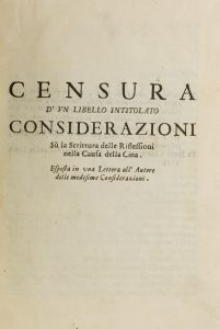 CENSURA d'un libello intitolato Considerazioni sù la Scrittura delle Riflessioni nella Causa della Cina. Esposta in una Lettera all'Autore delle medesime Considerazioni. S.n.t. [post 1703].