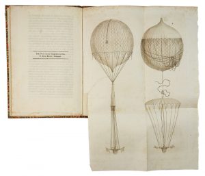 In-8° (mm 222x142). Pagine 7, [1] con il ritratto della Garnerin in ovale in antiporta e 1 tavola ripiegata in fine raffigurante il pallone con appeso il paracadute prima e dopo il lancio.
