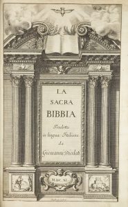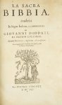 LA SACRA BIBBIA, tradotta in lingua Italiana, e commentata daGIOVANNI Diodati di nation lucchese. Seconda editione, migliorata ed accresciuta. S.l. [Ginevra] : per Pietro Chovët, 1641.