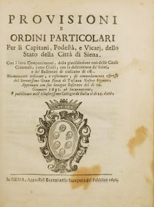 PROVISIONI E ORDINI PARTICOLARI per li Capitani, Potestà, e Vicarj, dello Stato della Città di Siena. In Siena : Appresso 'l Bonetti, 1692.