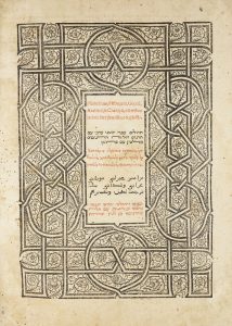 Frontespizio e testo stampati in inchiostro rosso e nero e in latino, ebraico, greco, arabo e caldeo ; il frontespizio incorniciato da un'elaborata bordura a motivo geometrico orientaleggiante incisa in legno, capilettera xilografici. Esemplare un po' rifilato nel margine superiore, con lievi gore d'acqua anche estese lungo il volume e con un esile lavoro di tarlo che interessa seppur minimamente il testo alle ultime 5 carte, ma nel complesso bella copia. Legatura settecentesca in piena pergamena rigida con titoli manoscritti al dorso, lievemente lisa. Timbro di collezione Calleri al contropiatto.
