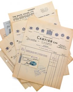 Factures, Londres 1946 9 Factures acquittées dont 3 concernent le règlement de broches représentant des Croix de Lorraine, réalisées par les bijoutiers Cartier Ltd à Londres, en juillet 1946, pour le Général de Gaulle.
