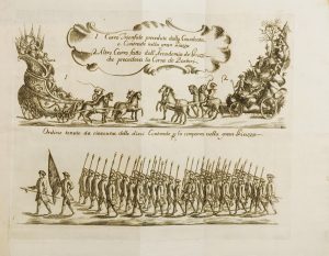 • Di eccezionale rarità. Le tavole ripiegate riproducono Parte d'uno degli archi trionfali coll'ordine de' portici che circondavano la gran piazza, i carri trionfali e le coreografie delle contrade e il Parterre fatto costruire nella gran piazza di Siena per la festa di ballo con Maschere.
