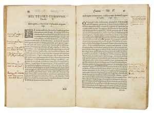 Bella e interessante copia degli Statuti dei Cavalieri di Santo Stefano, resa pregevole dalla graziosa miniatura al piatto anteriore, dalle fitte postille di mano coeva che accompagnano tutto il testo e dalle ultime 7 carte, interamente manoscritte.