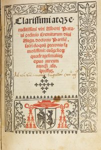 • Rarissima edizione originale di questi dotti commenti di Alberto da Padova ai Vangeli quaresimali, impreziosita da un bel legno raffigurante sant'Agostino con il libro delle regole fra i monaci eremitani, racchiuso da una «bordure orn. à fond criblé» (Sander I, 195) ;