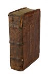 Legatura coeva in piena pelle con cornici concentriche di duplice filetto alternate a roulette di fregi fogliati impresse a secco ai piatti, e al centro fregio realizzato con ferro fitomorfo. Punte, cerniere e cuffie stanche. Due diversi ex-libris applicati al contropiatto anteriore, nota di possesso di mano cinquecentesca al frontespizio..