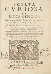 ASTOFI GIOVANNI FELICE, Scelta curiosa et ricca officina di varie antiche, e moderne Istorie, divisa in tre lirri [sic!]… In Venetia : appresso gli heredi di Marchió Sessa, 1602.