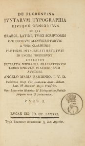 BANDINI ANGELO MARIA, De Florentina Iuntarum typographia [...]. Pars I (-II). Lucae : Typis Francisci Bonsignori, 1791.