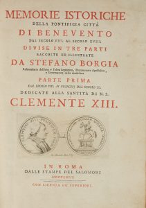 BORGIA STEFANO, Memorie istoriche della pontificia città di Benevento dal secolo VIII al secolo XVIII [...] parte prima (-seconda). In Roma : dalle stampe del Salomoni, 1763-64.