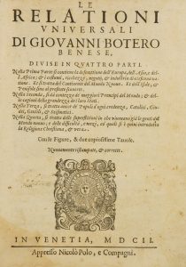 BOTERO GIOVANNI, Le Relationi universali […] divise in quattro parti… In Venetia : Appresso Nicolò Polo, 1602.