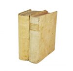 Esemplare con difetti vari e legatura in piena pergamena rigida, con dorso parzialmente scollato e titoli al dorso.