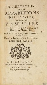 CALMET AUGUSTIN, Dissertations sur les apparitions des esprits, et sur les vampires ou le revenans de Hongrie, de Moravie, &c… A Einsidlen : dans la Princiere Abbaie par Jean Everhard Kalin, 1749.