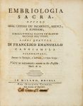CANGIAMILA FRANCESCO EMANUELE, Embriologia sacra, ovvero Dell'uffizio de' sacerdoti, medici, e superiori, circa l'eterna salute de' bambini racchiusi nell'utero, libri quattro. In Milano : per Giuseppe Cairoli, 1751.