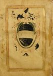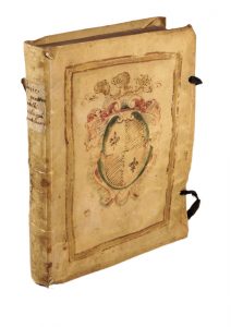 Legatura coeva in piena pergamena floscia con legacci conservati nella sola parte anteriore e due graziosi stemmi a colori disegnati ai piatti.