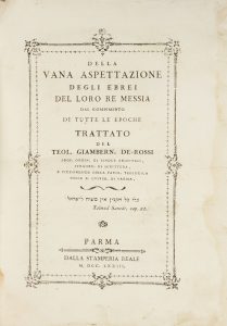 • Id., Della vana aspettazione degli ebrei del loro Re Messia dal compimento di tutte le epoche. Trattato... Parma : dalla stamperia reale, 1773. 2 opere in 1 volume in-8° (mm 212x152). Pagine [8], XV, [1], 244.