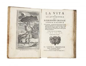 DEFOE DANIEL, La vita e le avventure di Robinson Crusoe storia galante… In Venezia : presso Domenico Occhi, 1738.