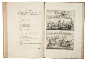 • Prima edizione di questa celebre opera del Fontana sulle imprese militari dei Cavalieri di Santo Stefano, resa pregevole dalle 37 belle incisioni calcografiche realizzate da Hendrick Verschuring che ripropongono i teatri di guerra delle più importanti battaglie navali combattute dalla flotta toscana contro i turchi, come quelle presso Algeri e Namur.