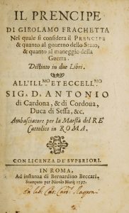 FRACHETTA GIROLAMO, Il prencipe [..] nel quale si considera il prencipe & quanto al governo dello stato, & quanto al maneggio della guerra. Distinto in due libri… In Roma : ad instanza di Bernardino Beccari stampato per Nicolo Mutij, 1597.