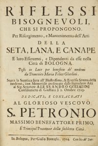 GHERLINI DOMENICO MARIA FELICE, Riflessi bisognevoli, che si propongono. Per risorgimento, e mantenimento dell'arti della seta, lana, e canape e loro essercenti, e dipendenti da esse nella citta di Bologna… In Bologna : Per Giulio Borzaghi, 1714.