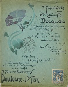 floral à l’aquarelle destinée à : Mademoiselle Antoinette Docquois, Marchande de Pommes de Terre frites, fournisseur de S.A.R. le prince des Hirondelle... ». Élégante et amusante adresse tracée de sa caractéristique écriture de lettriste. Lettre exposée et reproduite au catalogue d’une exposition Art Nouveau, au Musée d’Orsay.