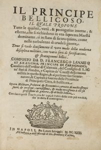 LANARIO Y ARAGON FRANCISCO, Il principe bellicoso, il quale propone tutte le qualità, virtù, e prerogative… In Napoli : per Lazaro Scoriggio, 1631.