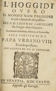 LANCELLOTTI SECONDO, Hoggidì overo il mondo non peggiore ne più calamitoso del passato… In Venetia : Appresso gli Guerigli, 1637.