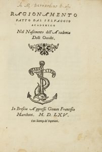 LAURO COSIMO, Ragionamento fatto dal Selvaggio academico nel nascimento dell'Academia delli Occolti. In Brescia : Appresso Giovan Francesco Marchetti, 1565.