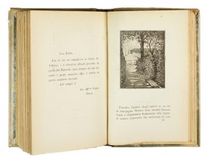 In-16° (mm 187x120). Pagine 202, [1], 1 bianca. Con 18 belle acqueforti incise su veline e applicate alle pagine. Lievi arrossature sparse ma ottima copia, quasi interamente intonsa. Legatura moderna in mezza pelle verde con punte e piatti marmorizzati, titoli impressi in oro al dorso a 4 nervi, conservata all'interno la brossura originale.