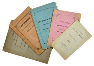 • Sull'accentramento dell'Arte italiana in Roma. Pensieri di un critico francese. Torino : Casanova, 1880. In-16° (mm 155x90). Pagine 22. Brossura originale, con uno strappo al piatto anteriore. Dedica di Pastoris «All'amico Signorini».