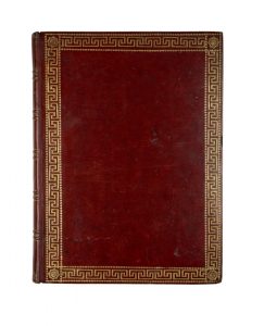 ♦ Splendida legatura coeva in marocchino rosso a grana lunga con una meandro alla greca impresso in oro ai piatti contornato da una filetto puntinato e con piccoli fregi geometrici impressi agli angoli della cornice e ripetuti al dorso, dentelles alle unghiature, titoli dorati su tasselli al dorso ; tagli dorati ; minimi difetti