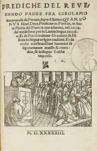 ► Raro. Cfr. Bibl. Savonaroliana 87 «Avec une superbe fig. grav. s. bois [...] Savonarola préchant devant un auditoire nombreaux ; sur la chaire une marque avec les initiales B O S ; aux pieds de la chaire le notaire Lorenzo Violi écrivant les paroles du prédicateur» ; Essling III, 180 ; Ginori Conti 8 ; Giovannozzi 158 ; Sander 6834 in nota. Manca ad Adams.