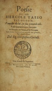 TASSO ERCOLE, Poesie [...] composte da lui, in sua giovanile età… In Bergamo : per Comin Ventura, 1593.