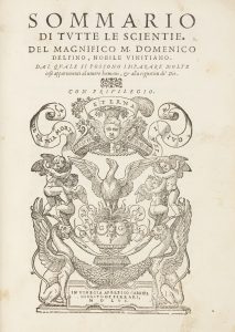 TORRE ALFONSO de la, Sommario di tutte le scientie. Del Magnifico M. Domenico Delfino [...] dal quale si possono imparare molte cose appartenenti al vivere humano, & alla cognition de' Dio. In Vinegia : appresso Gabriel Giolito de' Ferrari, 1556.