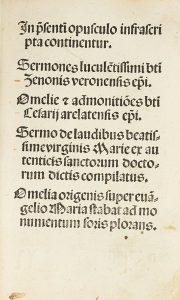 ZENO SANTO, In presenti opusculo infrascripta continentur. Sermones luculentissimi [...]. Omelie & admonitiones beati Cesarij arelatensis episcopi... (Al colophon : ) Venetijs diligentissime impressi : per magistrum Iacobum de Leuco impensis domini...