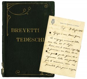 ARTOM ALESSANDRO, raccolta di oltre 200 documenti che comprendono carte di lavoro, minute di lettere scritte da Artom, lettere ricevute, brevetti manoscritti con disegni originali esplicativi ecc. Datate 1899-1920 circa.