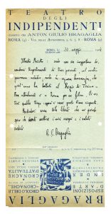 Manoscritto a inchiostro nero su carta intestata 'Teatro degli Indipendenti diretto da Anton Giulio Bragaglia".