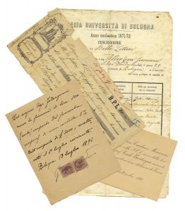 La raccolta comprende : scheda dell'Università di Bologna (1871-1872) con firme autografe del poeta, firma autografa su ricevuta, annotazione e firma autografa su un buono della Banca Popolare di Credito di Bologna, biglietto di nozze della figlia di Carducci, Beatrice.