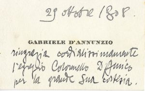 • "[...] Gabriele D'Annunzio ringrazia cordialissimamente l'egregio Colonnello D'Amico per la grande sua cortesia".