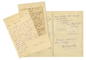 FOGAZZARO ANTONIO, Insieme di 3 lettere autografe firmate, 1 biglietto da visita con busta autografa e 1 diploma dell''Accademia Olimpica' con firma autografa dello scrittore. Datate fine ‘800 - inizio ‘900.