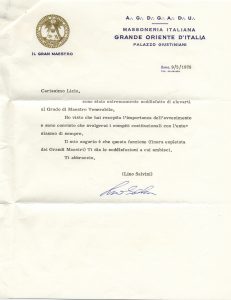 Licio Gelli scrive : "Mi è gradito trasmetterti, in allegato, copia della lettera che il Gran Maestro si è compiaciuto farmi pervenire subito dopo la cerimonia dell'insediamento delle Luci e delle Cariche della R. L.