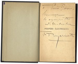 MARINETTI FILIPPO TOMMASO, Dedica autografa su libro 'Marinetti. Poupées Eletriques […]. Paris, Sansot 1909'.