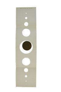 Biglietto di auguri realizzato su cartoncino bianco più volte ripiegato con fori circolari e un cerchio dorato e appeso. Al margine superiore dell'opera è indicato a stampa : "Auguri 1961 – Bruno Danese – Milano – piazza S. Fedele 2". Al margine inferiore, sempre a stampa "Munari". Dimensioni 600x150 mm.