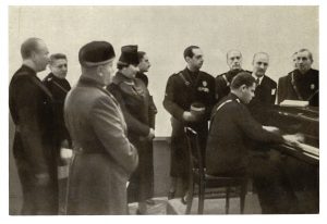 MUSSOLINI BENITO, Ritratto fotografico (foto-cartolina) che ritrae il Duce, con alcuni gerarchi fascisti, mentre ascolta il pianista Vico La Volpe. Datata al verso 16 dicembre 1936, Roma.