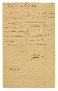 Testo in francese. 2 brevi strappi della carta, senza mancanze e perdite di testo. Dimensioni : 187x107 mm.